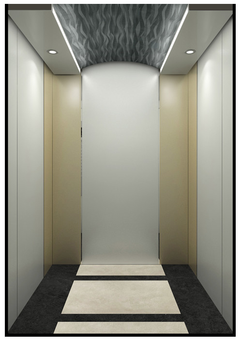 轎廂型號:YG-1622  天井:白色砂紋噴漆板(YG-05)+鏡面不銹鋼  兩側、后側板:兩側香檳色砂紋鋼板(YG-07),后側香檳色砂紋鋼板(YG-07)+深咖色砂紋烤漆板(YG-08)+鏡面飾條  前側板、門楣:緞紋不銹鋼  轎門:緞紋不銹鋼  地板:FL-P34(米黃PVC)  操作盤:BD-D2F1
